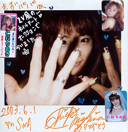 もずのわくわく劇場日記 No.73-2 「お姉さんになった仁科ちあきの巻 」後編 いやはや、ここにいるとまた不可解な話が始まるから場内へ入ろう。 2回目のフィナーレが始まるぞ♪ カバンからタンバリンを取り出してと。 ズンチャカズンチャカ♪ 踊り子さん達が紹介されながら一人づつ出て来る・・・ 仁科ちあきは一番シモテ側に立つ。そしてそのとなりに松本浬香。二人は姉と妹分なのだ。 ほ〜ぅ、確かに仲が良さそうだ。おこちゃま「ちあき」に仔猫がじゃれ付くようにして、松本浬香が笑ってる。ちあきは毎度ボ〜っとしていると、浬香はちあきの顔をのぞき込むようにして、しきりに何か話しかけている。 ちあきは、んっ ? と言う風に首をかしげ、「ほら、ちゃんとしなさい !」と浬香の世話を焼く。ふふふふっ♪ なんて言う微笑ましい光景か (^。^) そう思いながらチャラチャラとタンバリンを振っている私だが、またしてもあの時の事を思い出してしまった。そうあれは・・・ 同じSNAのステージの上、渡辺理緒さんと仁科ちあきの師弟競演の時があった。その時の仁科ちあきは、初めての関東出演、しかも大好きな渡辺理緒さんと一緒のフィナーレで上機嫌。おおはしゃぎで渡辺理緒の横に立ち、仔猫がじゃれ付くようにしてヘラヘラしていた。すると渡辺理緒さんは、「ほら、ちゃんとしなさい ! 」と言うようにして、仁科ちあきの世話を焼いていた。 あれから一年・・・ 時の流れは一人の少女を確実に成長させているのか。 妹分の松本浬香は姉の仁科ちあきよりも、ちっちゃくて活発だ。顔だけみるとむしろ仁科ちあきよりも大人びた顔をしている。それでも童顔の仁科ちあきの言う事は、しおらしいほど素直に聞く。その様子がなんとも無性にかわいくてたまらない。(微笑) さて、2回目のフィナーレが終わり、休憩を挟んで三回目の香盤。花のトップステージを飾るのは、ご存知、仁科ちあき嬢。前回の栗橋でショーの内容は把握しているので、今回は冷静に楽しめそうだ。暗い中から背中を向けて登場し、これ以上は無いと言わんばかりのおこちゃま花嫁のステージ。今日はヘンに余裕のある私は、オープニングまでの暗闇の中、毎度一番後ろの立ち見の席から、闇にまぎれてソロソロとカミテ側のカーテンを背中でたどり、盆に近いところへ移動。 暗にリボンは投げないけれど、私は「仁科ちあき隊」だよ♪ と言うように、ささやかな自己アピール。(なぜ ?) 今回はいつものリボンさん来てないみたいだし、たまには近くに行ってもいいかなぁ〜なんて思ってね。(^^ゞ タンバリンを叩きながら仁科ちあき嬢のダンスを楽しんでいると、前回初めて見た時には見落としていた所が結構冷静に見えてきた。仁科ちあき嬢、良く見ているとかなりの演技派の踊り子サン。ステージでハイジャンプを披露したり、顔の表情も単に笑顔というものでも、かなり神経が行き渡っていて、奥行きの深い所を見せている。ボディーランゲージも大きく、メリハリが効いていて、本人はどこまで意識して演技しているのかは知らないが、とても良い仕上がりになっている。 自分的には成長の跡が見えてると思う。ロビーや駐車場で立ち話をしている時の、仁科ちあきチャンとは別人のようで、ステージと言う所はああいう風に人を変えてしまう所なのかと、今さらながらに感じた。 前半三曲を踊り終えた仁科ちあき嬢は、ベットへと進んで行く。もうタンバリンは用済みなので、この場に突っ立っていてもしょうがない。盆まわりの席が空いていたので、近くで仁科ちあきを見たろ♪と思い、盆脇のカブリツキの席に陣取る。ってか、これには訳があり、ベットでの最初の曲、通算4曲目のバラードがいい曲で、じわ〜っと心温まるんだよね(笑) 仁科ちあきは舞台で濡れた黒い瞳をウルウルさせながら、BGM のバラードにあわせ踊っている。夢を見ているような感覚で、それを見ていると舞台から素早く小走りに盆へ走り出て来た。盆のカミテサイドでカブリ付いている私の眼の前を通り過ぎ、盆の最前部でベット着のスソをひるがえし、清らかなターン・・・ その時私の所へ、衣装の広がる際に発生する風が、そよ風のように届き、鼻をくすぐった。それは、ほのかに甘く優しく、いとおしい香りだ。ちあきの香り・・・ かな ? ふふふ♪ かくして聖少女、仁科ちあきのベットは美しくもドラマティックな展開で終了となった。 さてポラショーに移ると、またおこちゃま振りを発揮♪ お茶目な会話でお客さんを楽しませてくれる。 いきなりパチン ! と手を打って、一体何が起きたのかと思えば「はははは♪ 蚊が飛んでたよ。」と、屈託の無い笑いで、場を盛り上げている。 ころ合を見計らって自分もポラを撮りに行き、もずパパの定番「今週のネイルア〜ト♪」と注文をする。 今回のちあきクンは、いつもに増して綺麗なネイルアート をしているので、どれどれと見ようとすると。 「このネイルアートね、オークションで買ったの