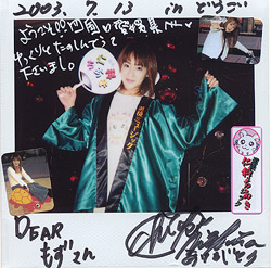 なんかね、ちあきクンにもどうやらホームページが出来るそうで、おめでと〜♪ と言う 気持ちを込めてちっとサービスタイトル作ってみたりして (笑) まぁ目新しい写真はないけどさ、右クリックで持ってけば。それぞれの画像はバラバラに 編集してあるから、携帯の待受画面にでもしてみたらいいんじゃなぁい ? (爆♪) 寸法やファイル容量は適宜好きなように各自で加工すること。(私っていじわる ? 笑) ではぼちぼち語りましょう。むかぁ〜し、むかしのことじゃった・・・そうじゃない! ニュー道後ミュージック BINGO 大会が終わって、第二回目のステージより始まるのだ。 華のトップステージを飾るのは、やはりここでも仁科ちあきクン。舞台の中央にしゃがみ こんで、スタンバイ OK♪ どうやら今回は「ウェディング」を踊るらしい。事前情報では 今回新作で踊るはずだったが、ちょっと使う曲が某姉さんとかぶってしまうのと、衣装が まだ間に合ってなかったそうで、それで「ウェディング」を踊る事になったと言う話であ る。まぁ新作はもう少し楽しみに待っていよう。 (^O^) 今回はるばると飛行機にまで乗ってここ道後に来たからには、気合入れてちあきクンの 応援するぞ〜っ ! と、タンバリンをギュッと握りしめる私。今回のちあきクンはスッキリ と髪をミディアムロングにカットしてとても夏っぽくっていい感じなのだ。 おっと ! そんなことを思っているうちに、ウェディングのイントロが始まってしまった。 ズンチャカズンチャカ♪ ちあきクンの軽快なステップに追従するようにパパのタンバリン は道後の場内にこだまする。ちあきクンは小さな目を丸くしていつものスマイル。 白いハーフブーツが飛び跳ねてる。なんて可愛いんだ♪ パパの心も一緒に飛び跳ねる♪ タンタカタンタカ♪ オープニングの曲って短いんだよね・・・ でも二曲目も調子の良い 曲だし、目いっぱい楽しもう♪ ・・・ありゃ ? ど、どうしたんだ ? もうベットの曲が 流れ出したぞ ? えぇ〜っ ! マジですかぁ〜っ ! 「くれたハートを体で包んで・・・」 間違いなくベットの曲だ。 うそ ? なんて言う超ショートバージョン・・・ 何か手違いがあったのか ? それとも 時間が押しまくっているから ? そんなぁ〜 殺生やぁ・・・ ちあきクンのステージが短かすぎるぅ〜 ! 私の心の叫びにはお構いなく、ベットを踊るちあきクンが微笑む・・・ 回転する盆の上で・・・ 回転する煩悩上で・・・ 何を考えてる >私 ? 「言葉にできないこの想いを・・・」ちあきクンはのけぞってポーズを決める。短くなった ちあきクンの栗色の髪が天使の輪を乱して揺れる・・・ あぁ・・・ これが出て来ると もう終わりだ。あ〜ん ! 物足りない物足りない物足りない物足りない物足りない・・・ それにしてもなぁ、やっぱ温泉場の劇場だよなぁ〜 浴衣のお客が宴会のノリで・・・ 作業着に鉢巻の若い衆が・・・ちあきクンの股間に拍手打って、拝んでど〜するんだよぅ。 えっ ? 観音様 ? ふぅ〜ん。ご利益あるんかねぇ〜・・・ ポラショ〜♪ 「お疲れ♪」 「ふへ♪ よ〜こそ道後へ (^O^)」 「今日なぁ、お昼ごろ松山についたん。でな、せっかくだからって、山登りして来た。」 「山登り ?」 「そう、松山城に登って来たんよ。」 「ふ〜ん、ごくろうさま。」 「だからもう疲れてるん。」 「・・・」 「どうしたの ?」 「べつに♪ ポーズは ? 」 「んじゃ、愛媛・松山・道後ミュージックって感じのヤツ♪」 「え〜 ? じゃぁ、チョットまってて。」 そう言ってちあきクンは立ち上がり、舞台カミテにある投光室へ行き・・・ 「みかん ! ミカン ! みかん ! え〜っ ? 無いのォ〜 じゃハッピでいい。」 と、こんなのを撮らせてくれました。 ![]() うん、今日もちあきクンは楽しくてかわいい♪ 甚だ簡単ではありますがぁ〜 これを以ってレポートに代えさせて頂きたいと 思います。ご清読、あ〜りがとうございました (爆♪) (^O^)はっはっはっ♪ だって、ステージ短いんだもん・・・ |