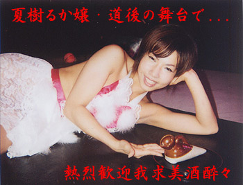 もずのわくわく"遠征"劇場日記 No.76-6 「ステージレポ・夏樹るか嬢 編 」その6 ![]() 時代は良く分らない・・・ ただここはアジアのとある国の、とあるうらぶれたアパートの一室。 おそらくは女性の一人住まいである。 お金持ちな女性・・・ でもなさそうだが・・・ 少なくともここの住人は充分に今の暮らしに満足しているようだ。 ただ一点、この住人に赤い花束を抱えてチャイムを鳴らす訪問者がいない事を除いては。 ではそんな彼女の暮らしぶりを少々のぞき見してみよう。 足元が悪いので、気をつけてくれ。それと、くれぐれも彼女に見つからないように ! ほらあそこ ! ナルシストな彼女が今日も一人で・・・ ふふふ♪ 夏樹るかは、オリエンタルなカウチに横たわっていた。 エキゾチックな紫の煙の揺らめく部屋の一室で、まったりとした時を楽しんでいる。 ハァ〜 なんてあたしはイイ女なのかしらん♪ うふふふ♪ 体をねじるようにしてゆっくりと立ち上がると、朱のチャイニーズドレスがあでやかに シルクの光沢を浮き立たせる。頭には手まりのような髪飾り、そして小さめの蛇の目傘 を持ち出して広げ、そっと肩に寄りかけるようにしてそれを射す。 一歩、二歩・・・ 歩いては立ち止まり、その度にニッコリと微笑を浮かべた。 まるで、彼女に幾千の誘惑の視線を投げかける男達の群れの中を、これみよがしに挑発 しながら歩く淑女を気取っているかのようだ。 ナルシストな彼女の見る夢は、きっとそのようなものなのだろう。 たった一人の部屋の中で、彼女は有頂天になってそんな風に歩き回っているのだから。 君はどこの誰よりキレイだよ。そうさ、まるでボタンの花が風に揺れているみたいに あぁ・・・君の前ではボタンの花さえ色あせてしまうかも知れない・・・ 彼女の頭の中ではそんな言葉が堂々巡り、いよいよ彼女のモノローグはスポットライト を浴びて悦に入る。あはは♪ うふふふ♪ ・・・ご満悦♪ いいオンナの条件、あでやかな服を身にまとい、ほんの飾りの日よけ傘、しゃなりしゃ なりと歩いては、どんな男達の誘いにも乗らず、涼しい顔して・・・ そうそう、お酒 なんかも飲んじゃったりしてネ♪ 夏樹るかはトックリなんぞを持ち出して、ムッフッフ♪ ホントは飲めないのにゴクリ ゴクリとトックリのお酒を飲んでしまう。ところがだ、ここからがさぁ大変 ! 体の中 が、カーッ ! と熱くなり、勢いがついてしまう。 よ〜っ ! よ〜っ ! 酔〜う♪ ヘイっ ! ヘイっ ! いよ〜っ ! ありゃりゃ・・・ こりゃダメだ ! 目が座っている・・・ 真正面を見据えてカンフー なんぞを始めてしまう・・・ うぷっ ! めがまわるぅ・・・ そりゃそうだ、酒飲んで 暴れりゃ誰でも酔いが回るよ。ふらふらになって再びカウチに戻り、倒れこむ。 熱い熱い・・・ あぁ、なんて熱いの、なんかあたしったらヘン、ヘンよ。うずくの。 こんなところが・・・あぁ、あぁ・・・ カウチの座布団をどけて枕の箱を開けると、おや ? 一人身の彼女を夜な夜な慰めるのは まぁ恥ずかしい、それはもしかして・・・ オンナも生身の身体、うづき出しちゃうと もう止まらないのよ。あ〜ん・・・ 夏樹るかはカミテに一度立ち去り、ステージを照明が幻想的に照らす・・・ 一人物思いにふけると言った感じのテレサテンの切ないバラードが漂うようにステージ へと流れ出す。そして再び夏樹るかは登場し、スポットを浴びた。 シースルーのベット着に包まれた夏樹るかは、しっとりとした足取りで盆に進み出る。 手にはあの枕の下から取り出したおとなの玩具。男根・・・ ナルシストな女が一人、熱く火照る身体を持て余し、優しい夜に抱かれつつ、誰の事を 思い描いて切ない宴(うたげ)を開くのか・・・ 夏樹るかは惜しげもなく素肌をさらし 指で自分を慰める。熱い身体の中に打ち寄せるさざ波が、しだいに大きく、うねるよう にして夏樹るかを濡らす。やがてそれは津波となって夏樹るかを飲み込み、しばし満潮 夏樹るかは桃色のモヤの中で眠った。 幾ばくの時が流れたのか、ふと夏樹るかは目を覚まし、あられもない自分の姿に気がつ くと、はっ ! と我に返り、誰かに見られていなかったかと周囲を見回した。 「イヤ〜ン♪ 」 ベット着を胸に抱きしめるようにして裸を隠すと、頬を赤らめた。 「私とした事が・・・ なんて恥ずかしい・・・」 そう言った仕草ですっと立ち上がると、ステージへ戻り、最初にはべっていたカウチの 座布団をどけ、箱枕の中にオモチャを焦って投げ込み、間髪をいれずにドサッ ! っと 座布団を上からかぶせた。 そして客席に向かって 「エヘヘ♪」と照れ笑い。ベット着を左手に抱えながら、カミ テの幕のところへ行き、パッ ! と振り向きざま、右手の人差し指を一本立てて、唇に 押しあて、「シ〜ッ ! 」とコケティッシュにイタズラっぽく笑い、「ひ・み・つ♪」 と言う仕草で証明が消えた・・・ どうでした ? お客さん、ナルシストな一人暮らしの彼女の部屋をのぞいた感