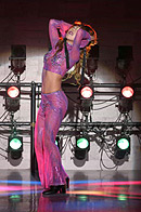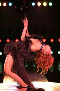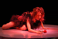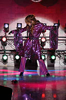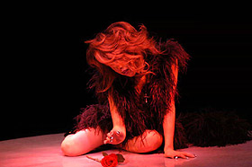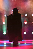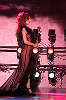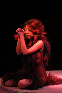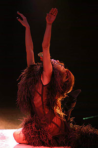 ステージに登場した渡辺理緒さんは、ピアノのイントロにのせて青い薔薇の花を一輪手に持ち、それを前方に突き出しながら、ステージの中央へ向かってゆっくりと歩いて行く。 眼になじみのある登場風景だ。紫のスパンコールの衣装を覆う黒いマントに身を包み、ミステリアスな 雰囲気をかもし出している。 おや? なんかパッ! としない感じがする。なぜだ? 私はタンバリンをにぎりしめたまま、あれぇ〜? とカミテのクーラー の脇で考え込む。 道後で見た時は、もっとインパクトのある感じがしたのに、妙に地味と言うのだろうか。しかし、その理由は程なく理解する事が出来た。 それは若松劇場の舞台照明に、原因がある事が分かったのだ。 この上の写真のシーンのあと、マントをひるがえし、紫の衣装をあらわにして、テンポアップしたダンスが展開されるのだが、非常に残念な事に若松の舞台照明は、バックスクリーンに強い光を放つライトがないのだ。 背景を縁取るようなレフランプが数多くあるのだが、光量が少なく、しかもオープニングの場面では赤を基調としたライティングであった。 そしてステージで踊る渡辺理緒を、浮かび上がらせるはずのピンスポットが、これもまたピンクの色調である。 場内が割りと広めな良い劇場であるのだが、その場内の広さと比較し て、全体としての光量が少なめであると言う感じがする。 渡辺理緒のこの作品「薔薇の封印」では、前半の衣装が濃いめの紫色 と言う事もあり、照明の色使いが非常に難しいのかもしれない。 やはり全体的な光量不足を補うためにも、ピンは無色の素のスポットが欲しかったなぁと言う気がする。 赤やピンクのライトの中に紫の衣装だから、どうしても踊り手が照明の色彩の中に埋没してしまい、視覚的なコントラストが弱く、インパクトのあるロケーションの「薔薇の封印」には、惜しくもなっていなかったようだ。 少しばかり話がそれてしまうのだが・・・ 神崎雪乃さんの「花嫁」や「影炎」と言う作品を、大和Mや上野などで見る機会が多かった。同じ作品を道後で踊っている時の、ビデオを見せていただく機会があった。そして見て、いきなりビックリ! した事がある。 同じ作品を踊っているのに、視覚的なインパクトがまったく違い、まるで別の作品を見ているかのようだった。神崎雪乃さんのステージがすごくきれいで、ダンスが上手くなったんじゃないかと言う錯覚? いや、失礼!(苦笑) 照明が変わるだけで、それほどまでに作品が活き活きとしたり、ピントがボケてしまったりするものなのだ。 つまり、踊り子を生かすも殺すも、照明の設備と投光のセンス一つと言っても過言ではない。それほど照明はステージにおいて、重要なファクターである。かと言って、若松の投光さんの事をどうのこうのと言っている訳ではなく、投光さんがどんなに歯ぎしりして頑張っても、設備がそれまでではどうにもならないと言う話。 さて、渡辺理緒のステージは進み、マントと帽子を払いのけるように脱ぎ捨て、さらにダンスは白熱して行く。 ステージに登場した時の「何者かが、眠りから目覚めた」と言う顔の 表情から、徐々に感情が高ぶり、さらにドラマはより深く展開して 行くと言うその様が、渡辺理緒の表情から見て取れる。 一見、淡々と冷静に、そして冷酷に踊っているように見える渡辺理緒の 体から発せられるエナジーを、眼ではなく五感で感じていると、これまでにない想いや、気迫が感じられる。 渡辺理緒に、一体何が起きているのだろうか? 長い事渡辺理緒のステージを見て来ている私にも良く分からないが、これほど踊りに集中して「踊れてる」渡辺理緒を見られるのは初めての事ではないだろうか。 「ノッテル♪」一言で言うと、そう言う事である。若松で渡辺理のステージを観劇出来た人は、幸運だと言っても良いかも 知れない。 夜の闇の中で目覚めた「バンパイア」渡辺理緒は、活動を始めたが掟破り のタブーを犯し、とある人間の女に心引かれ、自分が持っている宿命、 永遠の命と、やがて歳を取り、老いて死んで行く人間の女との愛、お互い 住む世界の違う事に苦悩する。 彼女の血を吸い、自分と同じバンパイアとし、永遠に二人生きて行くべきか それとも愛をあきらめ、彼女を人間としてその命をまっとうさせるべきか。 パンパイア・渡辺理緒は、永遠に生きて行く事の辛さを知っている。 この苦しさを「愛」する人にまで背負わせて、それでも自分の愛を貫き通すのか。 愛すればこそ、彼女を残して身を引く道を選択した。 そしてバンパイア・渡辺理緒は姿を消したのだった。 そしてステージは暗転する。 赤い照明だけがクルクルとステージを映し、時の経過を表現する。 シモテから真っ赤な薔薇の花を一輪、大切そうに持った女がソロリソロりと登場する。 女役を演じるのも当然、渡辺理緒である。渡辺理緒は一途な思いを胸に秘め、憂いのさなかと言う役作り。 一歩、一歩と言うように足
