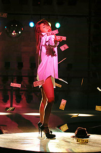 伊予鉄市電は見事にのんびりと道後温泉駅まで私を運んでくれた。 とにかく急いでファミリーマートへ行かなければ! ん? 違うって? いいんだってば。 寝て起きたのでハラが減ってるんだもん・・・ おやつのパンと飲み物をサクッ! っと買って来て道後ミュージックへ飛び込もうとすると、神村さんが入口で立っている。どした? なんか悪い事して立たされてるんか? (爆♪) あぁー! リオさんのサイン入りポスターが売ってる! まぁ、とりあえず中へ入ろう。 場内へ入ってあたりを見回すと、おお♪ お客さんいっぱいいるじゃん! シロさん、玉さん、たっちゃん、川ちゃんとみんな来ておる♪ そこへ立たされていた神村さんがやって来た。 「リオさんには間に合ったね。寝てたって?」と言って来た。 ホントにそうだったので、言い返せない。く、苦しい・・・ ステージでは一回目のきらら☆さんがオープンを踊っている。若松以来のご無沙汰ですねぇ♪ ともあれ、次はリオさんの出番だと思ってカバンを置いてスタンバイに入る。するとステージに登場して来たのは、土日だけスポット参加のマーベラスさんだった。あぁ、この人かぁ、リオさんが連れてきた人って。スリムな人だなー! 一体どんなステージするんだ? すると女装したマーベラスさんはチ○ポコの形をしたおもちゃをマイクに見立てて曲を流してクチパクしているだけ。 私はこう言うチ○ポコみたいなオモチャを出されると、ゲェー! っときちゃう。ダメなのこう言うのって。エロスって言うのは、絶対的に精神世界にあるもので、遊びのセックスを連想させるようなものには拒絶反応を起こす。オカマさんは全然平気なんだけどね。あのチ○ポコは勘弁してくれ。気持ち悪い・・・ あんまし見ない事にする。ごめん! リオさんのステージが始まるまでちょっと休憩して、鋭気を養う。 お? リオ隊のツートップ、たっちゃんとシロさんがリボンを持って移動し始めたぞ、もうすぐリオさんのステージが始まる♪ わくわく♪ わくわく♪ 私は後方の立ち見席でタンバリンを握り締め、リオさんが出てくるのをじっと待つ。 えっと・・・ 一回目は何を踊るんだっけ? ギャンブラーか? 確かギャンブラーだったと思ったな。と言う事は、タンバリンありだな。気合入れて行くぞー! 幕が開くとすっかり見慣れたボーイッシュなリオさんが立っている。始まりはのんびりとしたイントロで始まり、ナウ! レディースANDジェントルメン! と勢いのあるMCが入り、ファンファーレが鳴り出すと、リオさんのゴージャスでスリリングなダンスが始まる。ファンファーレからタンバリンを叩き始めるので、それまで待機。 うん、先週の郡山から久しぶりだって、何を言ってる。(爆♪) リオさんはいつもの通り、安定したダンスを踊り、ドン、ドン、ドンタカ、ドンタカと言うドラムだけのセクションが始まり、タンバリンを握り締めたリオ隊も、気合充電120%に達する。チャーン! タッタラァ〜と言う部分から、一斉にタンバリンをにぎやかにたたき出す! これぞ青春! カミテのシロさんがいつものように、斜めにスライドするような身のこなしでタンバリンを叩いてる。 これこれこれ♪ いいなぁシロさん♪ シロさんのたたき方見てると、こっちも燃えて来るな。私はシロさんがタンバリンを叩いている姿を見ながら、伝説のタンバリン対決を思い出していた。そうあれは、2005年7月10日の道後ミュージック・開館20周年記念大会での、若林美保さん「傷だらけの天使」のステージ。 覚えている人もいるかと思うけど、あれはすごかったね。縦揺れのわかみほ隊・Sさん VS 横揺れのリオ隊・Sさん、ダブルSさんによるタンバリン対決(爆♪) あの時の事は、私の頭の中に今でも映像となってしっかり記憶されている。今思い出しても背中がゾクゾクするくらい、二人とも見事なタンバリンさばきで、私とみかんちゃんはすっかり影が薄かった。(爆♪) しかも、わかみほさんもタンバリンに負けじと、ものすごい気合で踊りまくっていたしね。 恐るべきステージだったよね。 と、そんな事を思い出しながらリオさんやリオ隊を相対的に見ながら、ギャンブラーのステージは進んで行く。そして、女役のリオさん登場! ヒジまである長い手袋が上品で美しい♪ タンバリンは小休止。 ター、ター、ター、タン、タン、タン、タータンタンタン! タラリ・タラリ・タラリタン! と、このター、ター、ターの所からタンバリンが入る。この曲とリオさんの踊るチャールストンの場面が、なんともかわいくて私は好きである。ダンスショーを見てるって感じがして良いよね♪ と、コケティッシュな女役のリオさんを楽しんだ後は、また場面転換になって、帽子にワイシャツ、エナメルのピンヒールスタイルの男役・リオさんになり、曲もアコギとヘビーなドラムのリズムが渋い感じのR&Bになる。 ダッダ、ダッダ、ダッダ、ダッダ! 地面にたたきつけるようなリズムを、ドラムとベースがはじき出す。リオさんは客席に